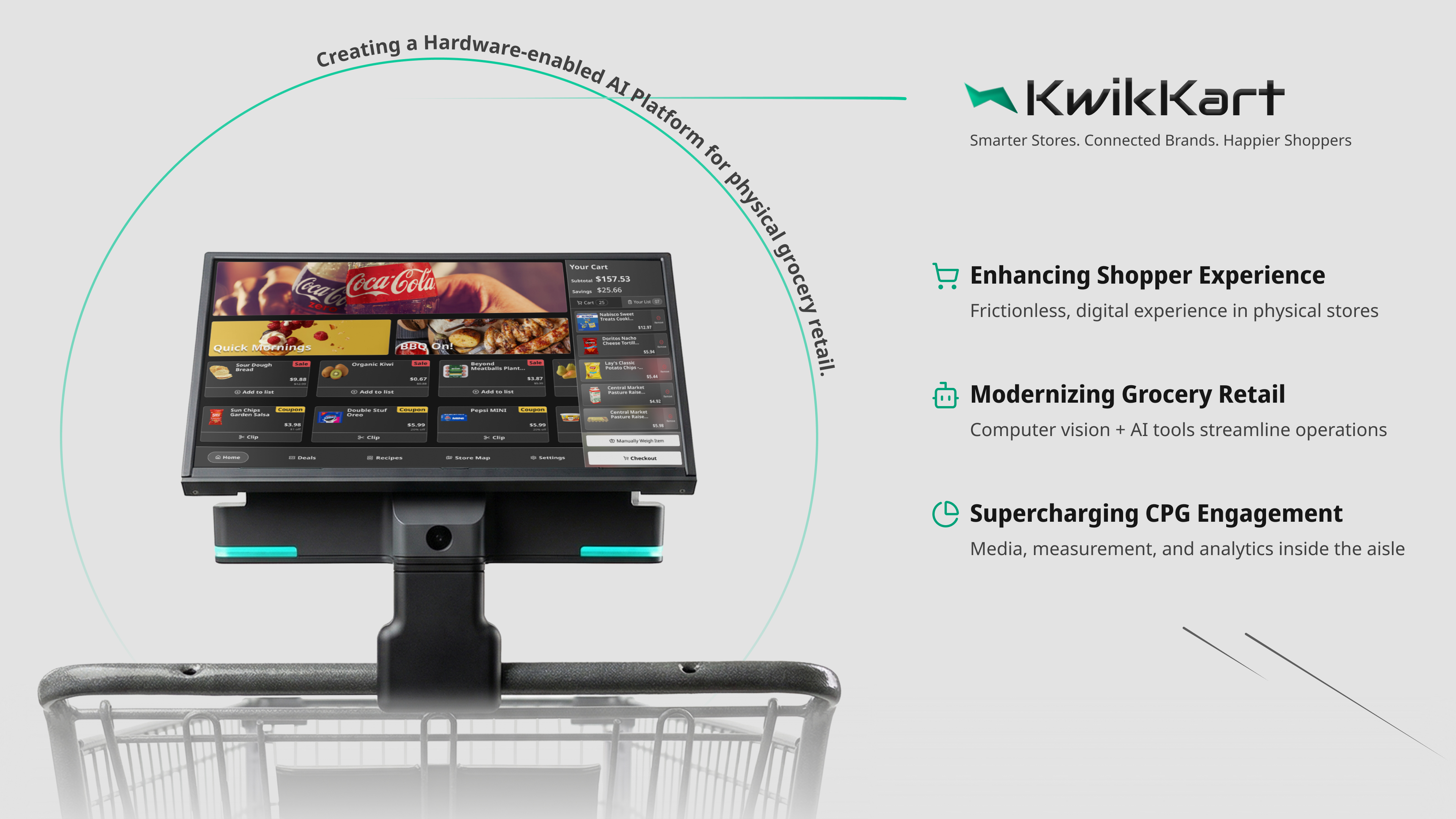 A hardware-enabled AI Platform for physical grocery retail. The Smart Checkout Device installs on shopping carts transforming grocery stores with frictionless checkout, theft-preventing computer vision, first party data analytics, and digital advertising for consumer brands (based on in-store shopper behavior and closed-loop data analytics).