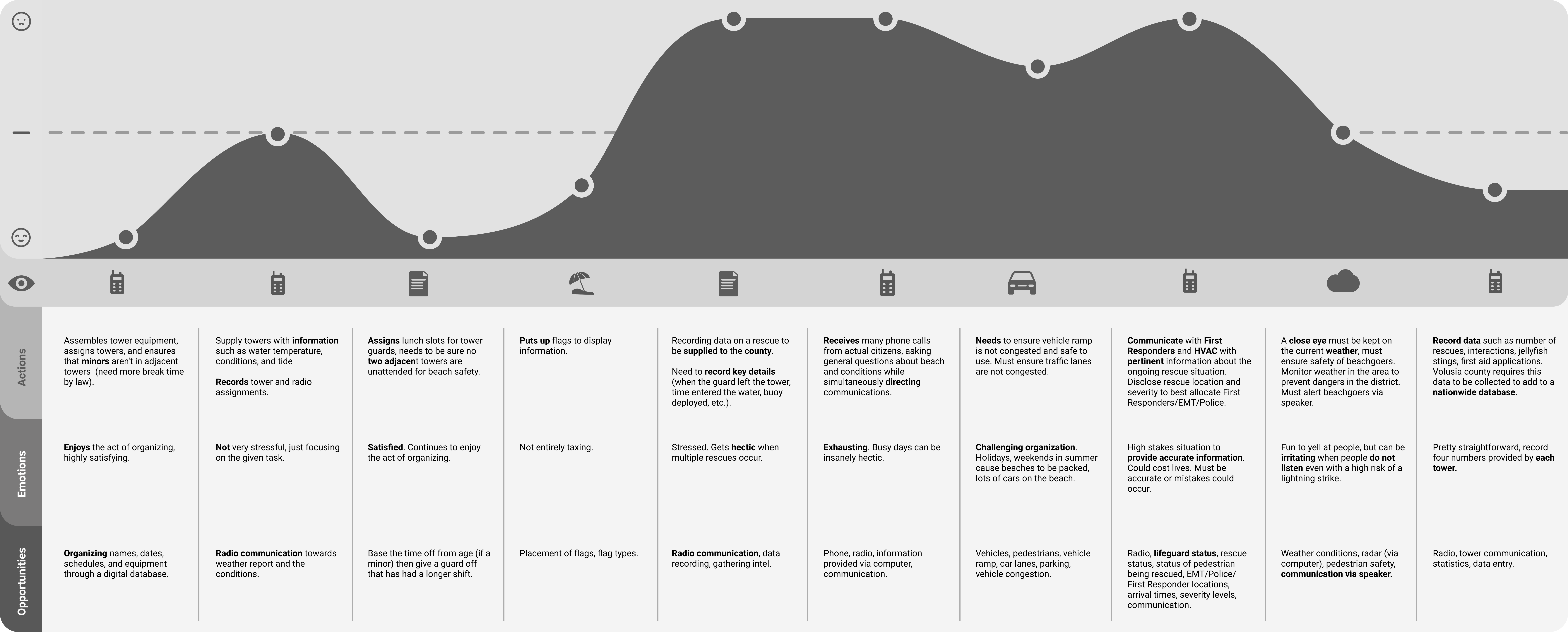 Below are journey maps of each job charting the current task, emotions, and opportunities of what they're doing.